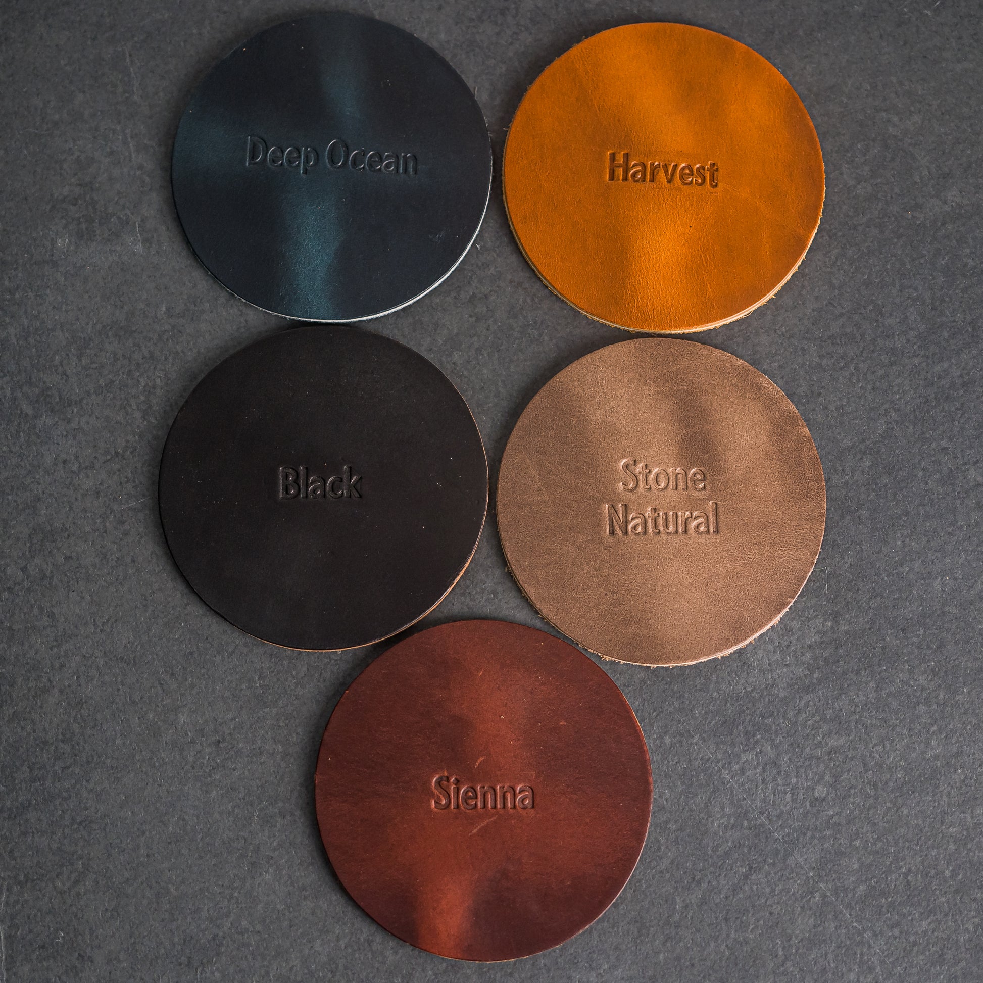 Choose from our Leather Colors: Harvest, Sienna, Black, Deep Ocean, and Stone Natural - part of the natural beauty and appeal is the variation from leather coaster to leather coaster (color and appearance)